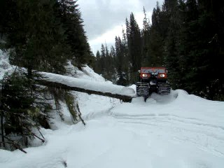 Here is a video of SnoOps crossing a fallen tree near Pierce, ID. No wonder he broke a track.