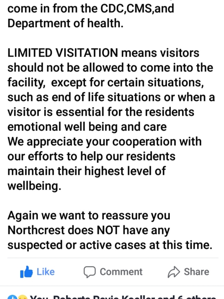 Our entire staff just got mass texts and they posted on our Facebook site that effective immediately we are under limited visitation at the facility until further notice.