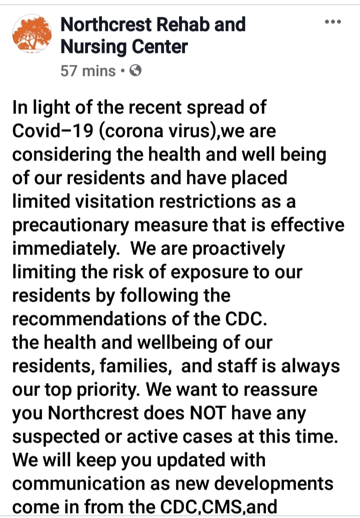 COVID-19 Update: The state issued a new order today limiting visitors at nursing homes to 1 visitor/patient. Everyone who enters a nursing home will have to have their temperature taken. The state also confirmed a 4th confirmed COVID-19 case, taking us to a new phase of the pandemic.