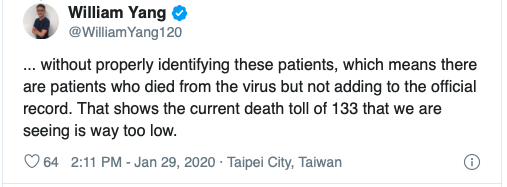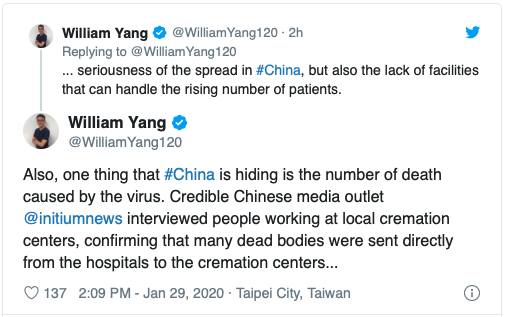 Also, one thing that #China is hiding is the number of death caused by the virus. Credible Chinese media outlet @initiumnews interviewed people working at local cremation centers, confirming that many dead bodies were sent directly from the hospitals to the cremation centers...