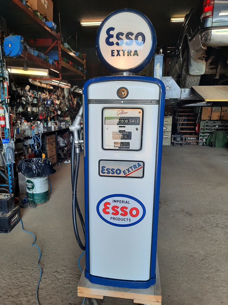 My old man used to work for Esso in the late seventies , a 1950 pump like this, they would throw in the dump back then. This one made it home, was in the barn for years ,it even donated a side panel for body tin "don't ask ". So we decided to restore it , that side panel can be yours for 200 bucks today, if you can find it , which we did. Other than the panel and a computer everything else was there, for a cosmetic resto , just needed door and glass rubbers and a repro globe. Blasted and massaged , blue and white for ESSO EXTRA colors , just have to put the glass in the panels. No it's not going outside, ......the original plan......, I can see a lawnmower launching a rock into the side of it , man cave it is.