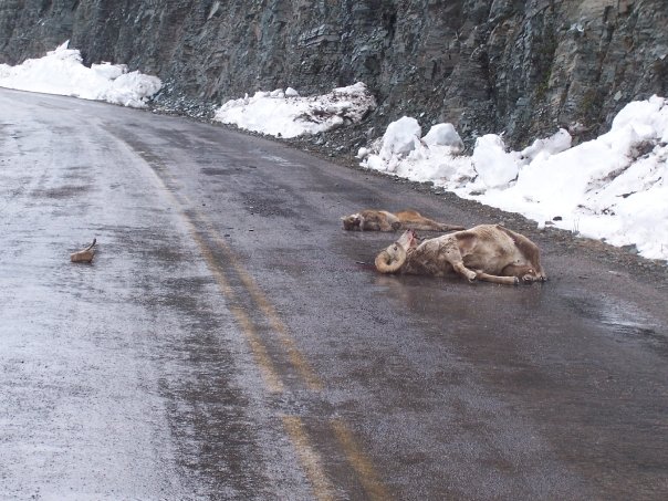 Background: My brother, Daniel, was visiting a friend in Montana and touring through Glacier National Park. They were hiking up a CLOSED ROAD when they came upon this scene. It is evident that the mountain lion and bighorn sheep were fighting on the mountain and fell to their immediate death sometime during the struggle. Pay special attention to the mouth of the mountain lion.....as it still has sheep hide in its mouth!!!! ENJOY!