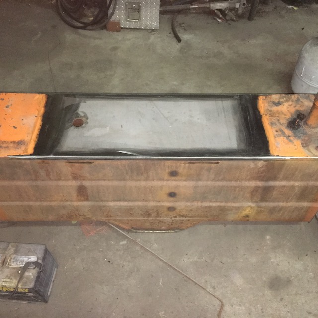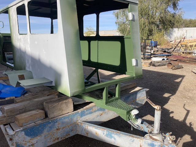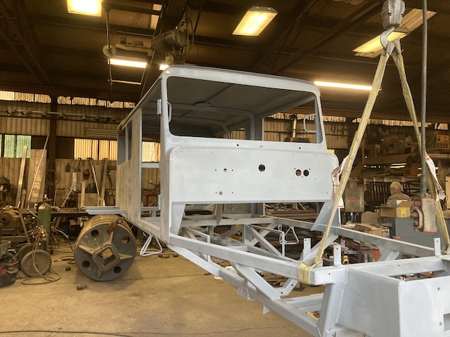 We had suspended the cab from a strap on the pintle hitch and Scott didn’t want to spray the strap with green paint. The pintle hitch was sprayed when we painted the exterior.