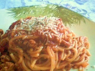 It somehow doesn't look as appetizing after all that potty talk.Spaghetti, made with the last container of homemade freezer pasta sauce from last year.
