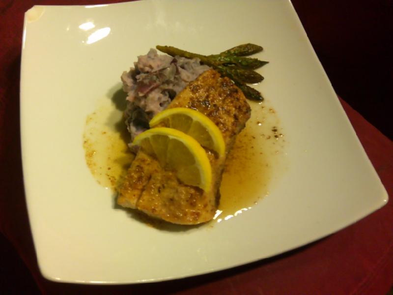the mahi-mahi meuniere i was gonna make last nite, roast asparagus tips, & smushed purple peruvians. can't wait to cook it again; this piece in the pic was only half the filet & i have another whole one in my freezer~