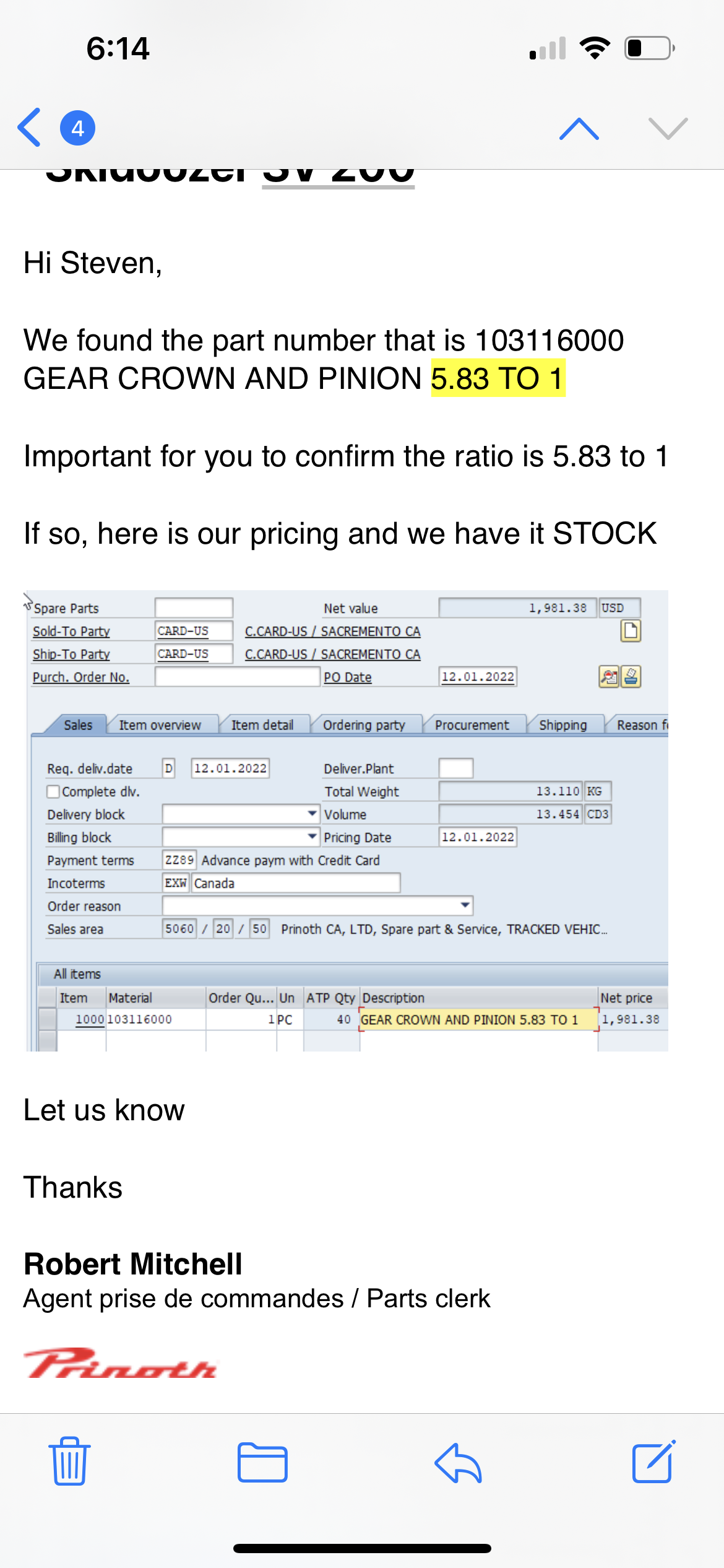 A new ring and pinion for my SV200 from Prinoth in Granby (Quebec) is currently US $2385. I have a local repair shop that is willing to do the work. But they have not done one before. We have the Bombardier instructions for complete disassembly of the differential (35 pages and calls for some special tools).